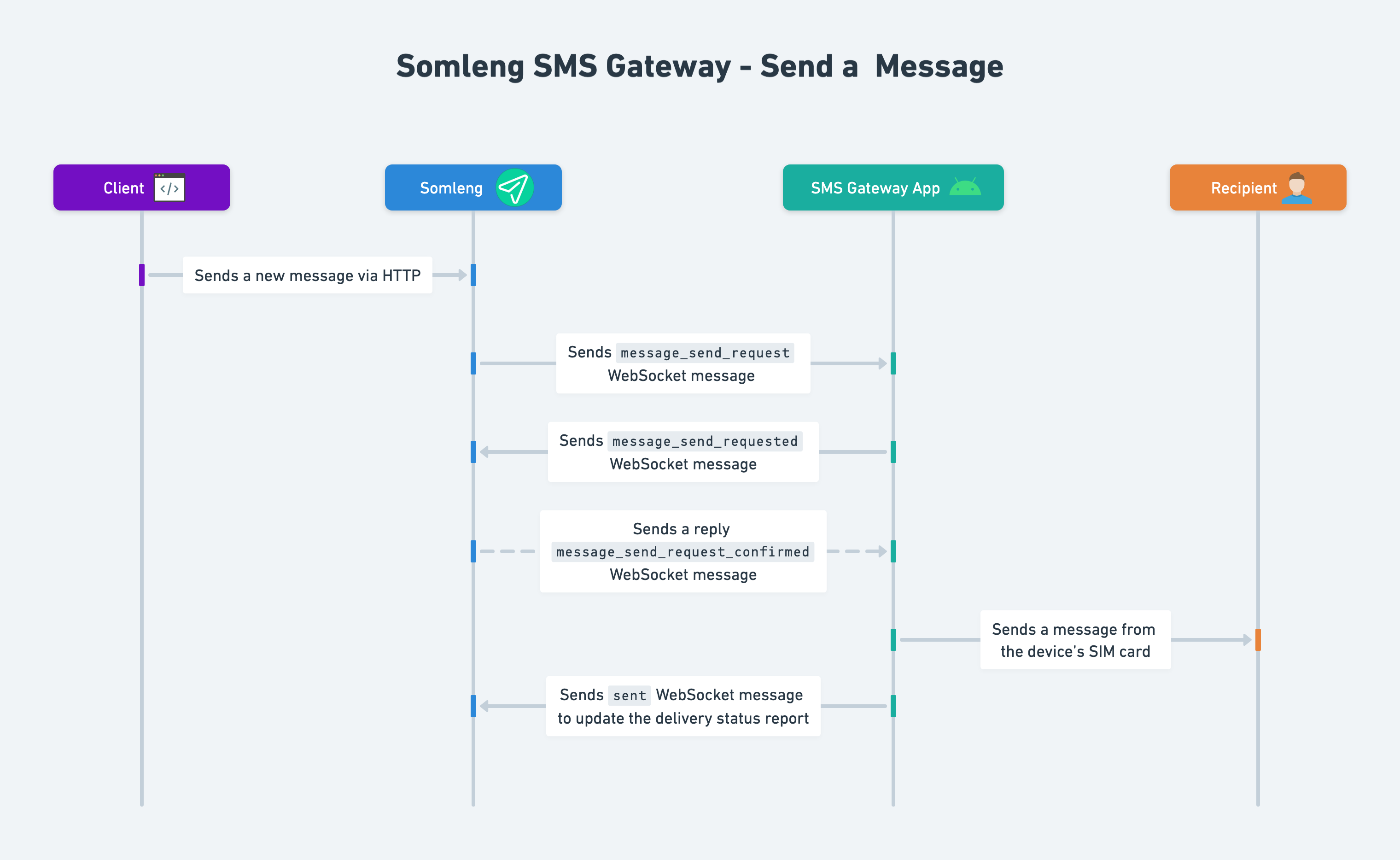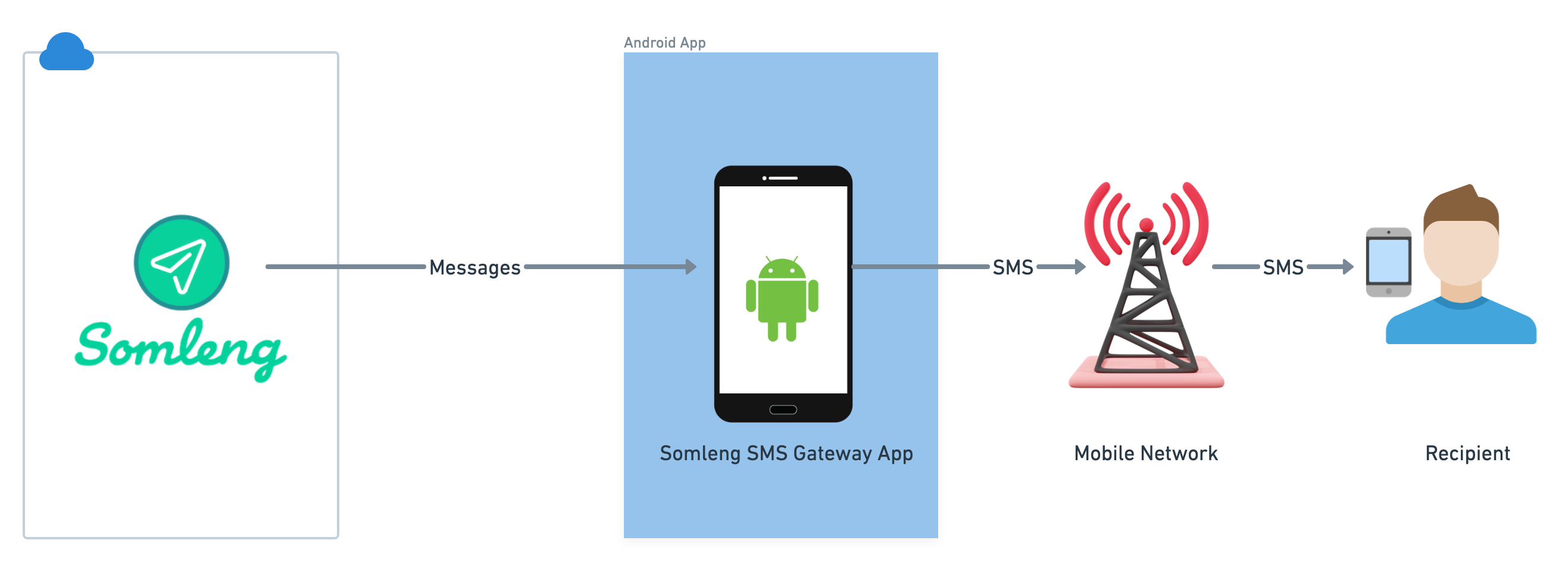 When your application sends a message using Somleng's Twilio-compatible API, Somleng assigns the message to a connected Android device. The device then delivers the SMS via the mobile network.