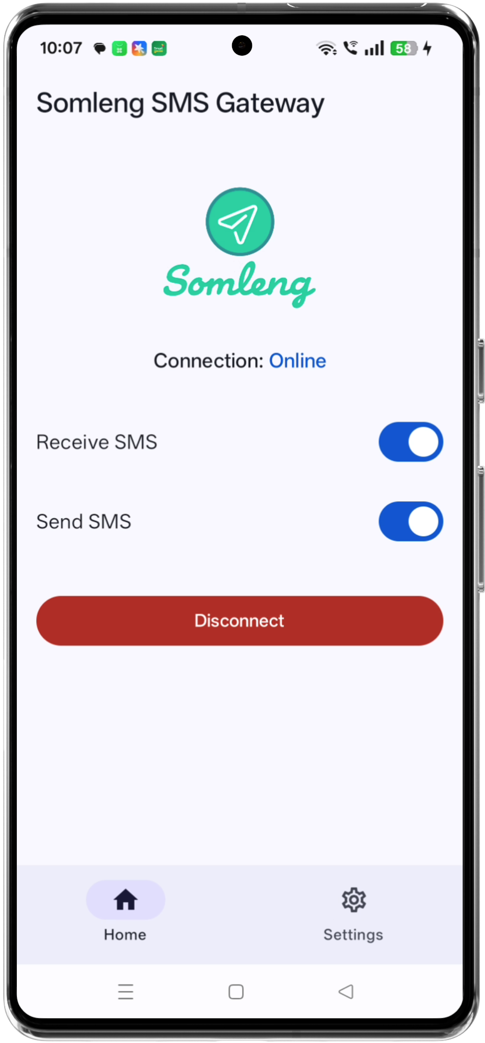 The app transforms any Android phone into an SMS gateway that communicates with Somleng using your Device Token. Once connected, Somleng routes outgoing and incoming messages through the device.