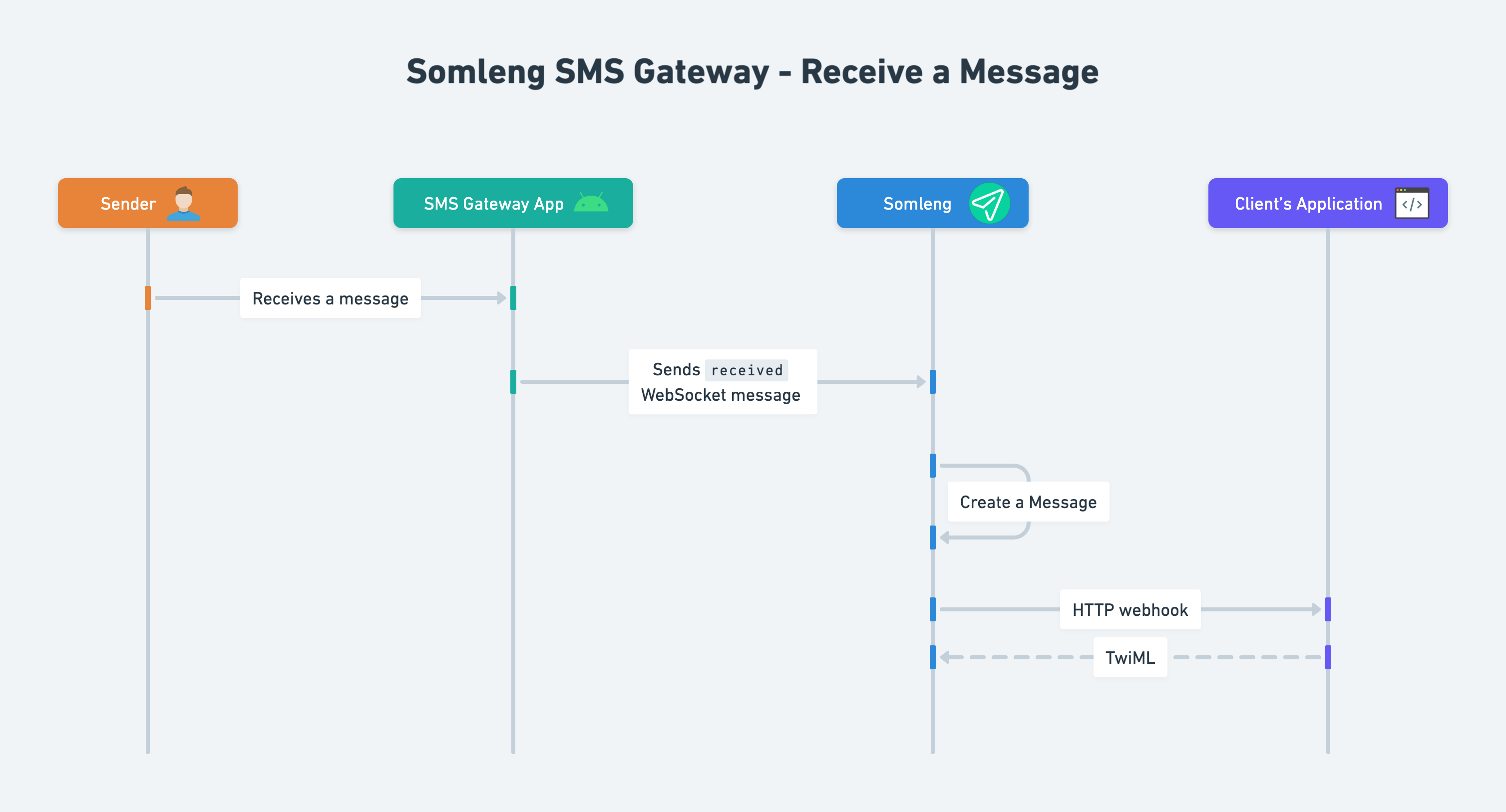 Incoming SMS messages received by the device's SIM card are automatically forwarded to Somleng, which then relays them to your webhook using Twilio-compatible parameters.